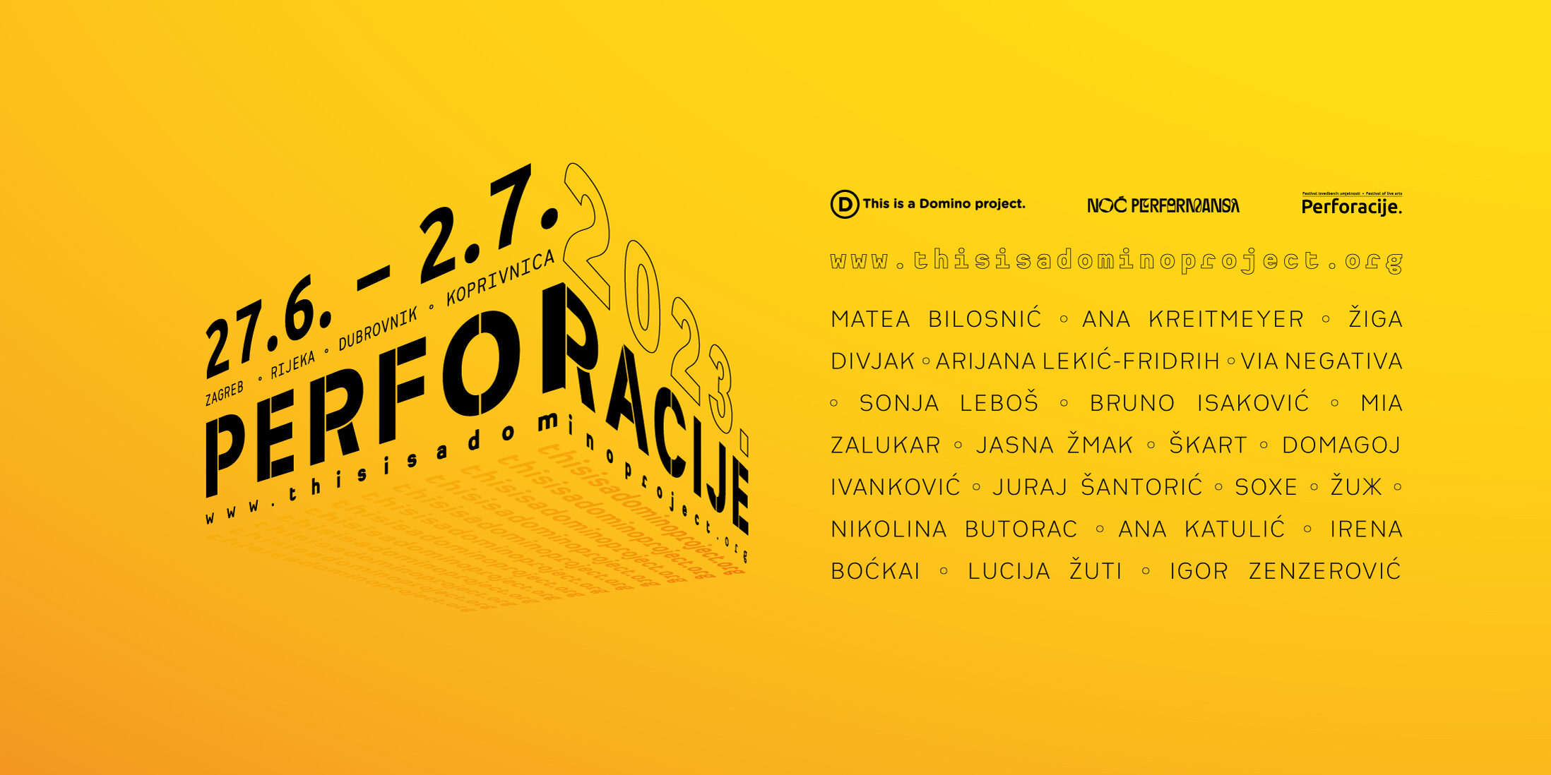 Petnaestu godinu zaredom festival Perforacije u organizaciji udruge Domino okuplja domaću i inozemnu nezavisnu scenu izvedbenih umjetnosti, u Zagrebu od 27. lipnja do 2. srpnja 2023. s gostovanjima programa 29. lipnja u Dubrovniku, 30. lipnja i 2. srpnja u Rijeci te 21. rujna, 5. i 7. prosinca u Koprivnici. Perforacije i Noć performansa u Zagrebu javnosti će predstaviti raznolik program u Medici, Zagrebačkom plesnom centru, Kerempuhu, Centru mladih Ribnjak, Booksi, Pogonu Jedinstvo, Zagrebačkom Velesajmu te javnom gradskom prostoru s ciljem podrške eksperimentu u kazalištu, plesu i performansu kroz interdisciplinarne autorske projekte.